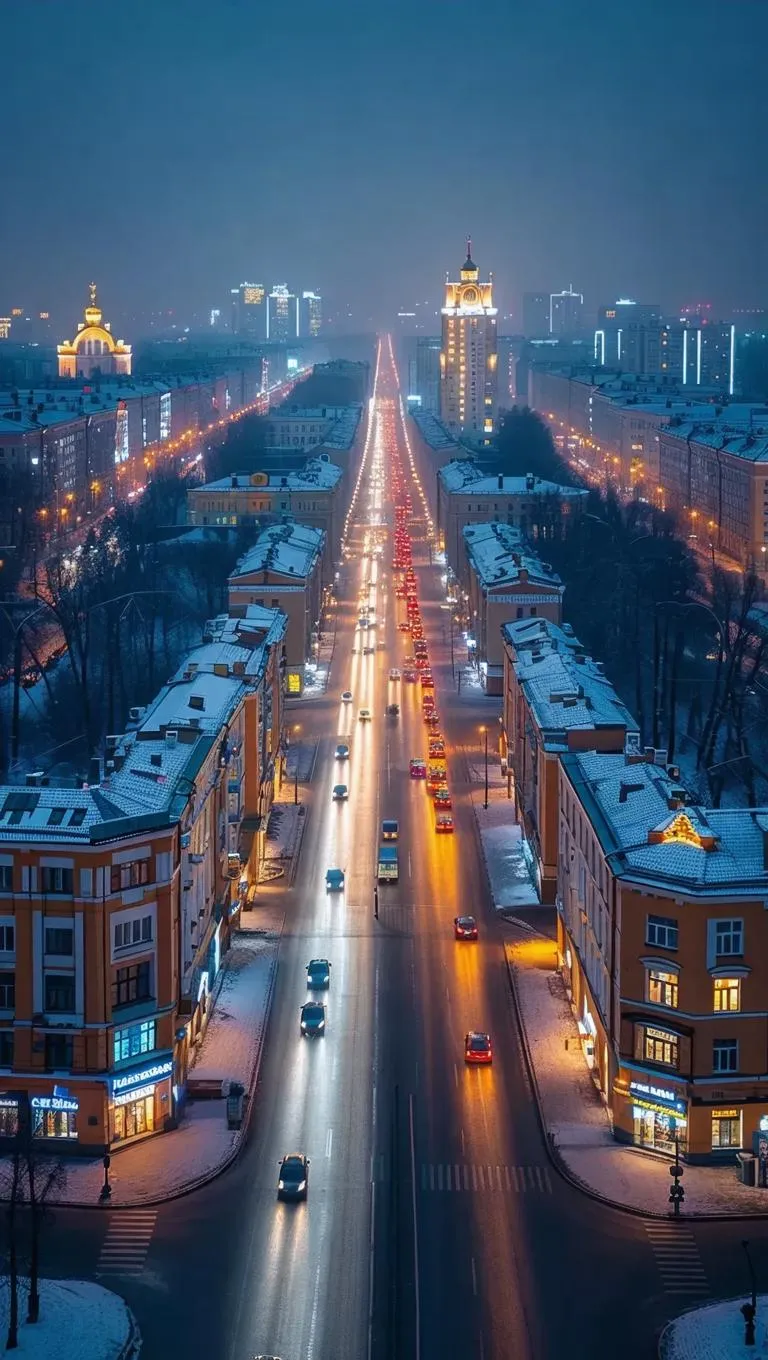 Ultra-detailed LEGO model of Kharkiv, Ukraine: Constructivist architecture illuminates Sumska Street under night skies. Drone-captured aerial view at 18 meters reveals bustling traffic, wide avenues, and vibrant city life. Perfect for AI-generated architectural visuals, creative inspiration, or immersive urban design projects. Explore Kharkiv’s iconic landmarks reimagined in LEGO with precision and dynamic nighttime energy.