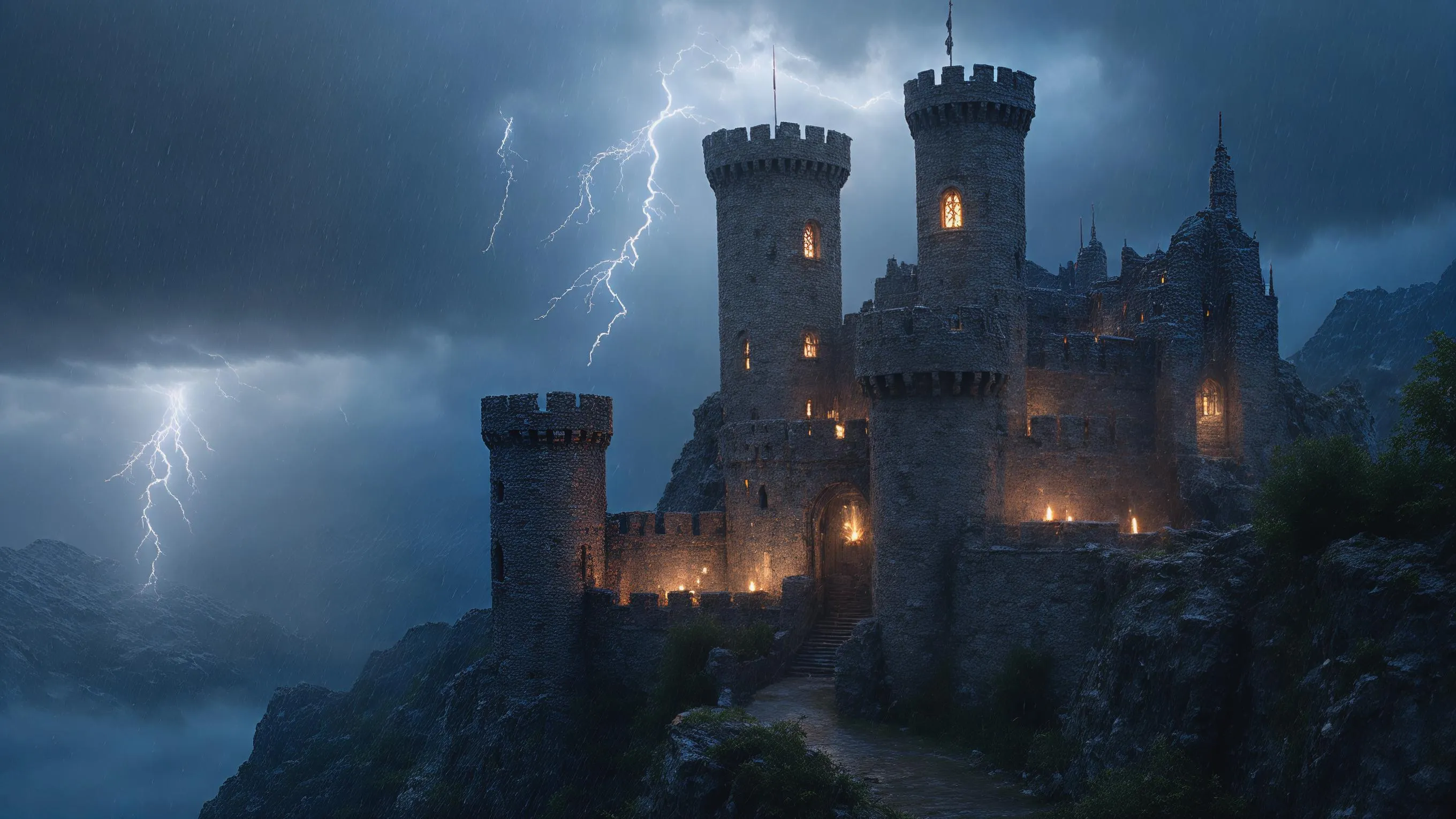 AI-generated photo of a stormy mountain castle with towering spires and fortified walls. Dark skies crackle with lightning amidst rain. Candle-lit windows glow mysteriously. Blending hyper-realistic detail with a powerful, mystical atmosphere. Create this AI art with VIVAGO.AI's image generator.
