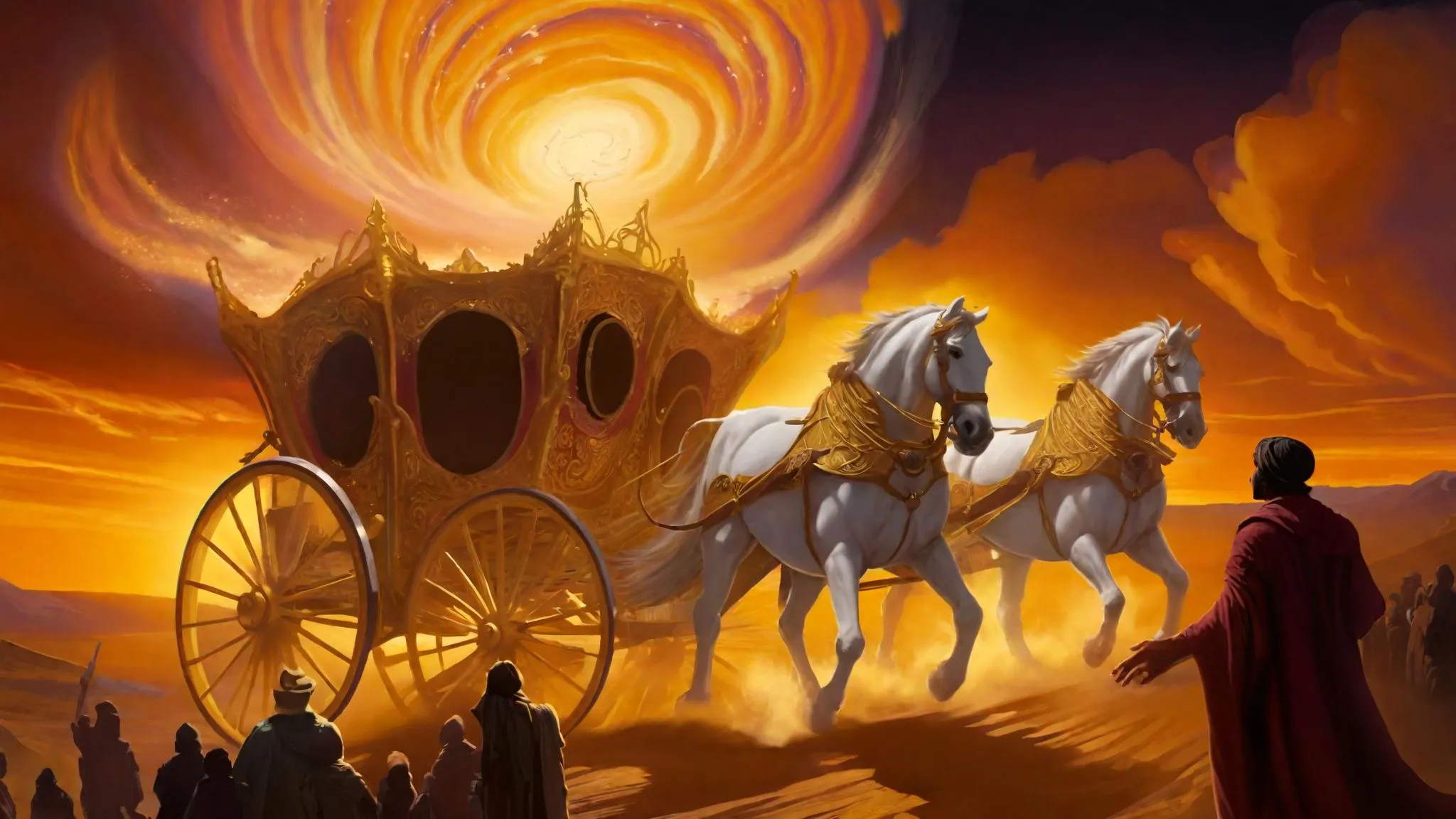 Create stunning AI-generated visuals of a fiery carriage with blazing horses soaring through the sky. Vivago.ai transforms your prompts into dynamic desert scenes with crowds gazing in awe. Explore AI effects for professional-grade, high-flying fantasy imagery.