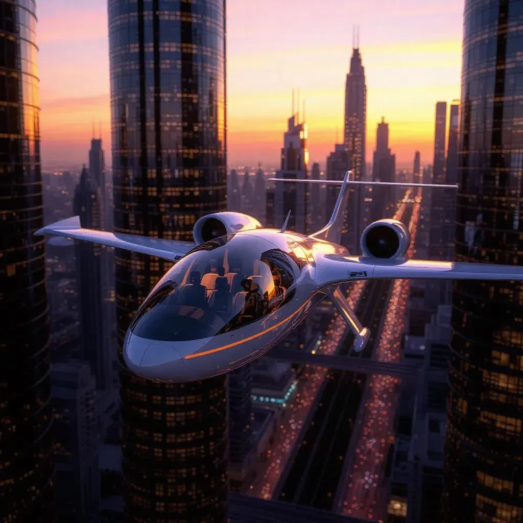 Generate AI-powered futuristic cityscapes with sleek white aircraft hovering among sunset-lit skyscrapers. Explore vivid cinematic scenes featuring aerodynamic hovercrafts, glowing glass towers, multi-level highways, and sunrise/sunset skies blending warm orange-pink hues. Perfect for sci-fi visuals and concept art creation using advanced AI image generation tools.