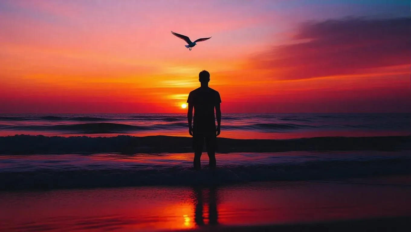 Create a poignant AI-generated image of a man's silhouette against a vibrant sunrise beach scene. Vivago.ai transforms text prompts into evocative visuals blending gentle waves, colorful skies, and emotional depth for professional storytelling.