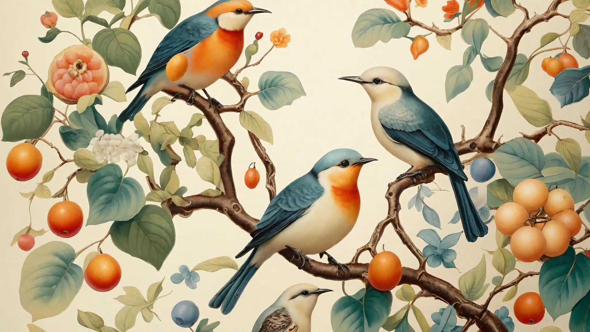 Create timeless AI-generated vintage illustrations with detailed birds perched on intertwined branches, lush fruits, and green leaves. Soft cream backgrounds highlight vibrant plumage—red-orange, blue, and crimson hues. Fine lines, hatching, and botanical-print elegance offer a classic aesthetic. Perfect for nature-inspired designs. Explore Vivago.ai’s AI tools for professional, traditional-style visuals with modern creativity.
