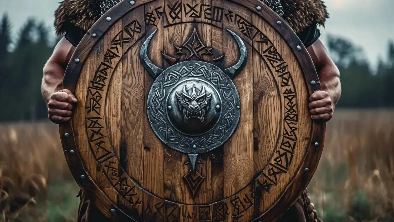 Craft a menacing Viking shield design with AI, featuring fierce Norse symbols, battle-worn textures, and sharp metallic accents. Generate intimidating, historically inspired visuals using modern AI artistry for eye-catching, dangerous Viking-themed creations.