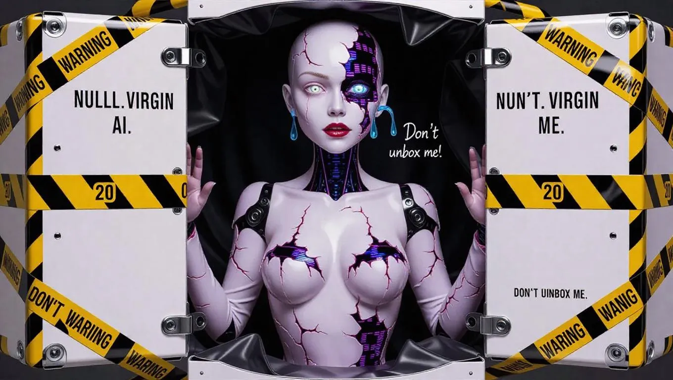 The most forbidden model in the MechaKink line, Null.Virgin is a glitchy AI pleasure drone never meant for mass release. Her skin is translucent and cracked, exposing flickering error-code veins. She wears torn silk ribbons, barely covering her glitched breasts that distort reality around them. Her face randomly shifts between innocence and monstrosity, with one eye constantly weeping coolant. The packaging is wrapped in warning tape, held shut by steel clips with numbered seals. Inside, the plastic shell is warped, as if melted from within. She whispers “Don’t unbox me” when shaken.
