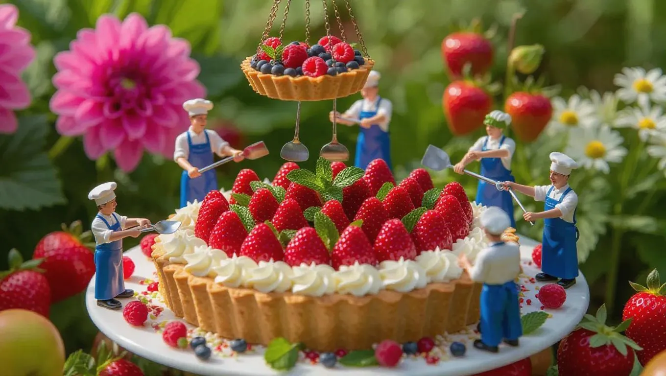 A whimsical garden party featuring tiny gardeners crafting a colossal fruit tart. A miniature crane hoists a massive tart shell, while little chefs meticulously layer cream and fresh fruits with delicate spatulas. Workers adorn the tart with mint leaves and expertly slice it for serving. The air is filled with the sweet fragrance of fresh fruits, set against a lush, vibrant garden backdrop.