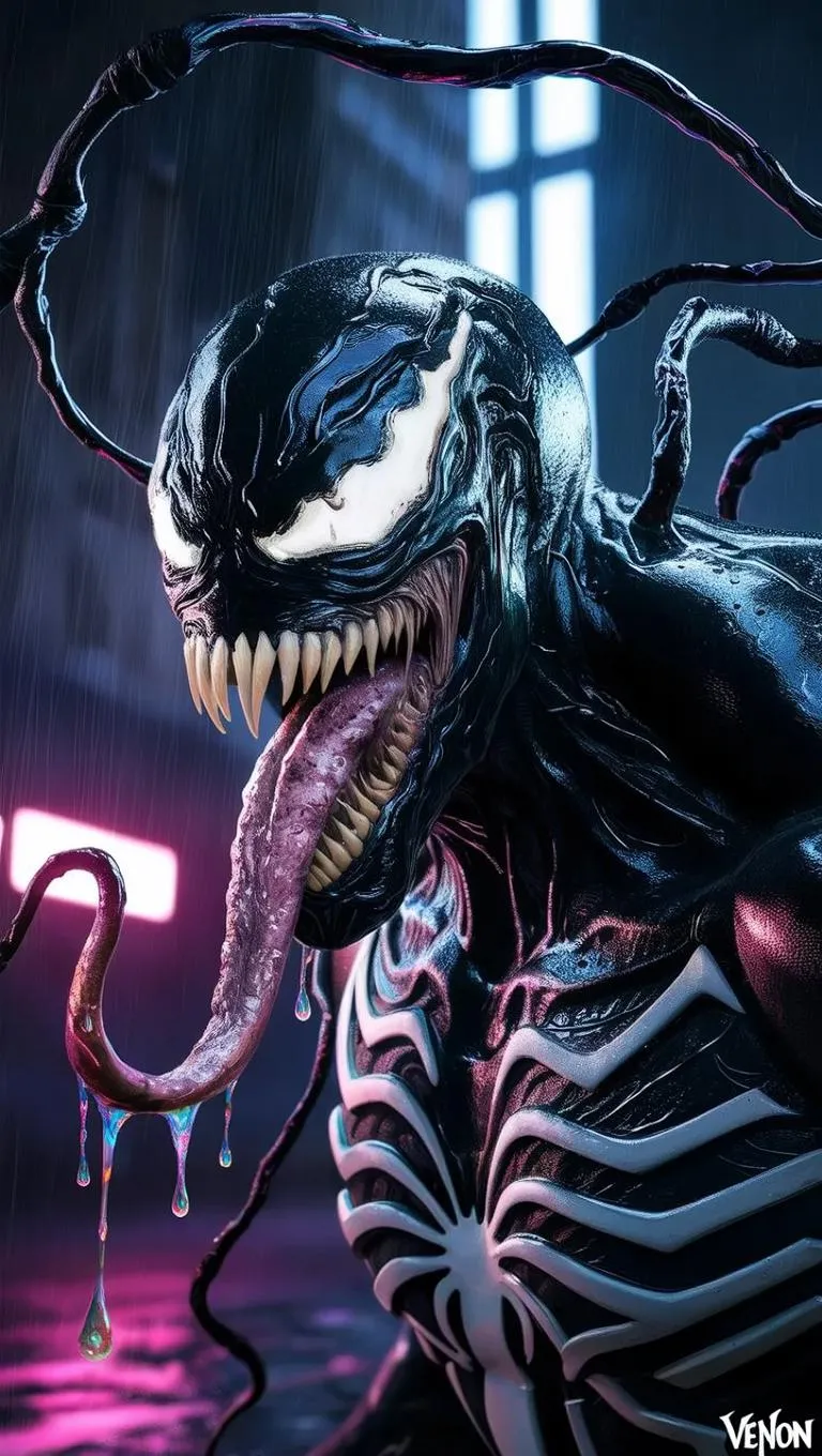 A hyper-detailed close-up of Venom, the sinister symbiote, with his glossy, tar-like black body rippling with muscular texture and veins of iridescent slime. His grotesque white spider emblem glows faintly against the darkness, while razor-sharp teeth glisten under dramatic cinematic lighting. An elongated tongue snakes out menacingly, droplets of saliva catching the neon haze of a rain-soaked urban backdrop. Tendrils of black ooze curl around his silhouette, emphasizing the liquid textures of his shifting form. Moody shadows contrast with sharp highlights, rendered in 8K photorealistic detail, capturing every pore and glossy surface in a chilling, otherworldly close-up.