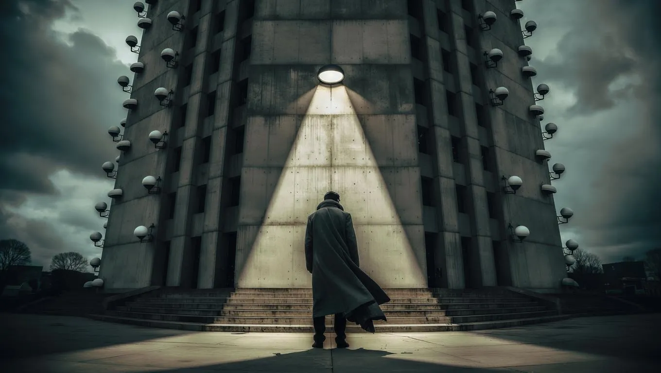 Generate hyper-realistic AI images of a dystopian lone figure confronting a colossal brutalist government structure with surveillance domes and sharp directional lighting. Inspired by Orwellian themes and modernist architecture, this cinematic scene combines ultra-detailed concrete textures, hyper-sharp outlines, and social realism for a haunting Hollywood-style visual narrative.