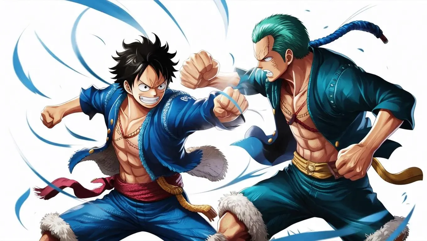 Generate vibrant AI anime artwork of Luffy and Zoro from One Piece in a playful clash. Featuring bold Sky Blue and Cobalt Blue accents against a crisp white backdrop, this dynamic duo scene combines action-packed energy with anime-style precision. Create striking AI-generated artwork effortlessly with VivaGo.ai's intuitive tools.