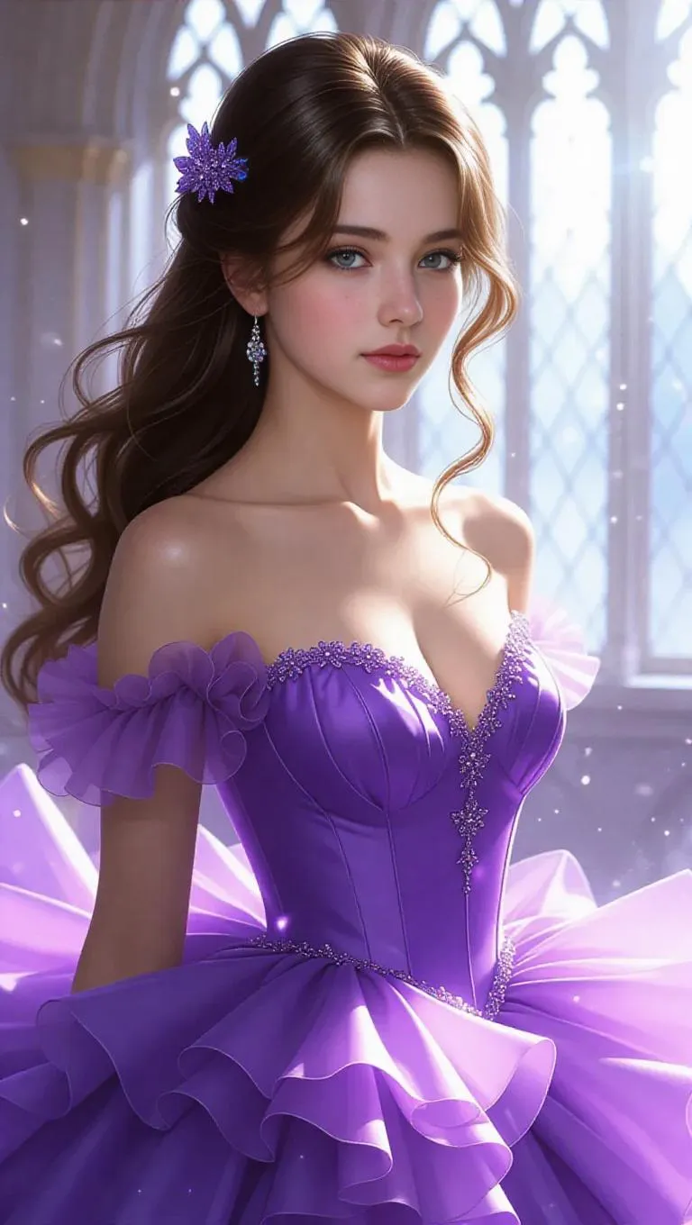 Create an AI-generated fantasy portrait of an elegant young woman in a lavish lavender gown, surrounded by ethereal fairy tale ambiance. Features cascading ruffles, delicate floral hair accents, and magical sparkles illuminated by soft natural light. Romantic digital painting techniques blend classical portraiture with dreamy color palettes for professional-grade fantasy art.