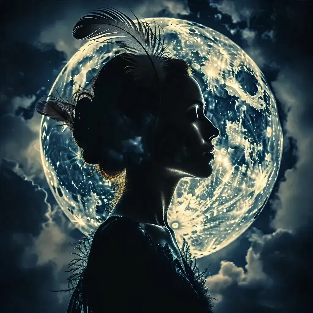Create mystical AI-generated art with a silhouette profile, intricate feather details, and a glowing full moon. Vivago.ai transforms prompts into ethereal visuals using surreal imagery, monochromatic contrast, and soft lighting for dreamy, symbolic photography with a mysterious ambiance.