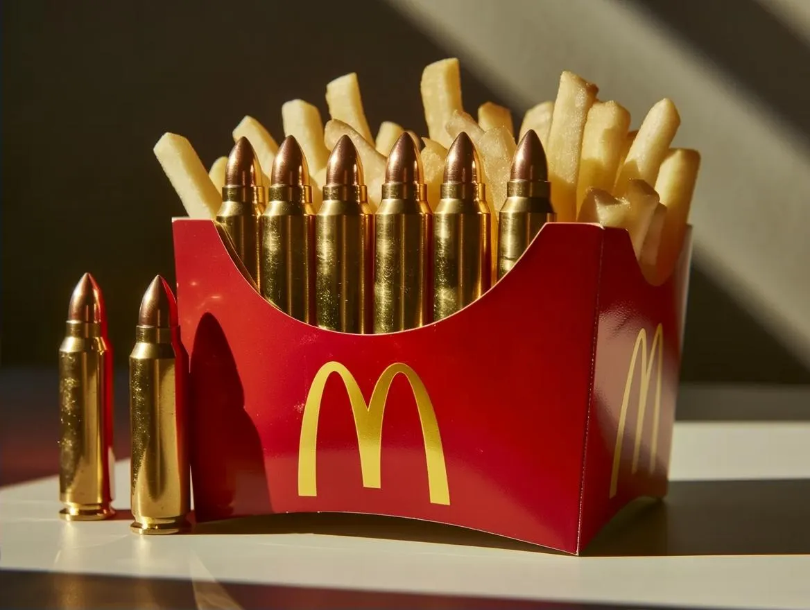 Create a hyper-realistic AI image merging McDonald's iconic red fries box with glinting brass bullets, crafted via text-to-image AI. Dramatic lighting highlights bullet textures against minimalist backgrounds, blending luxury ad aesthetics with pop culture symbolism. Explore provocative visual metaphors of consumption and violence through AI-generated photo-realistic transformations.