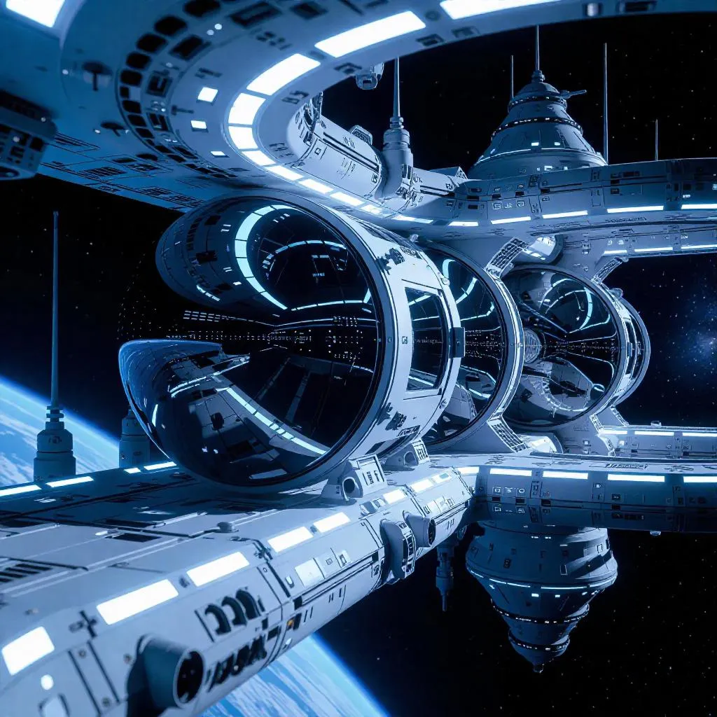 Explore AI-generated futuristic space platforms blending residential, technical, and navigational zones. Features durable materials, transparent glass domes, blue-white lighting, autonomous energy systems, and spacecraft docking modules. Detailed antennas, sensors, and celestial backdrops evoke advanced tech superiority and isolation in boundless starry realms. Perfect for sci-fi visuals, space colonies, or tech-driven design concepts.