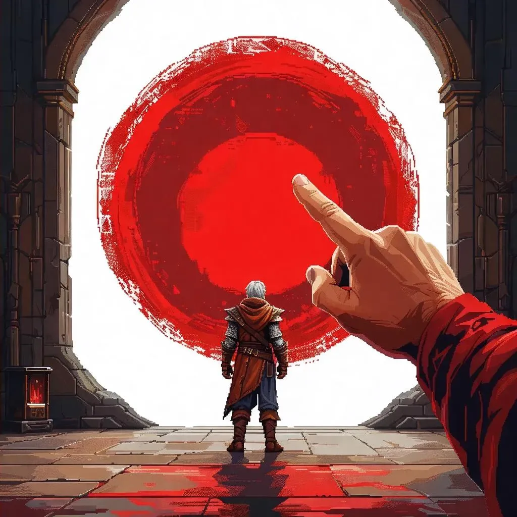 Create a close-up fantasy pixel art scene of a father's hand pointing at a mystical character encircled in red. This AI-generated hand-drawn style blends whimsical storytelling with retro aesthetics on a clean white background, perfect for imaginative projects and fantasy-themed visual narratives.