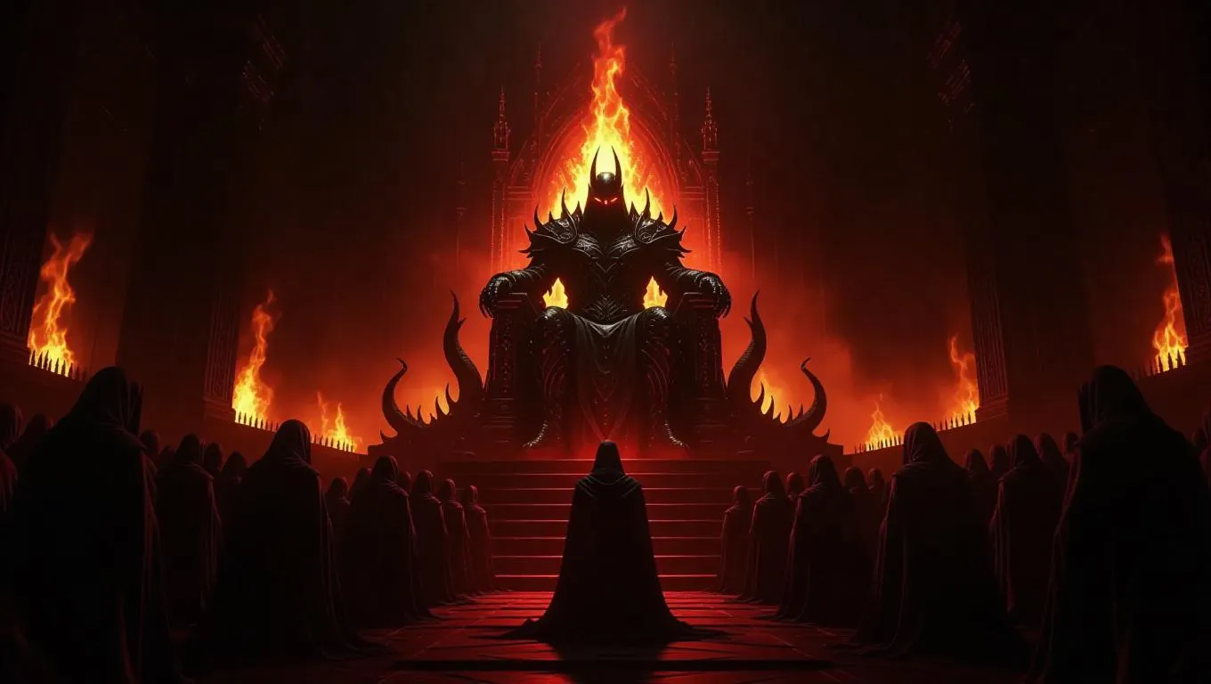 Craft AI-generated dark fantasy art featuring a fiery throne with the Lord of Darkness surrounded by demonic creatures, snakes, and hooded figures. Create supernatural imagery blending mythological scenes with AI-powered visual effects for striking digital projects.