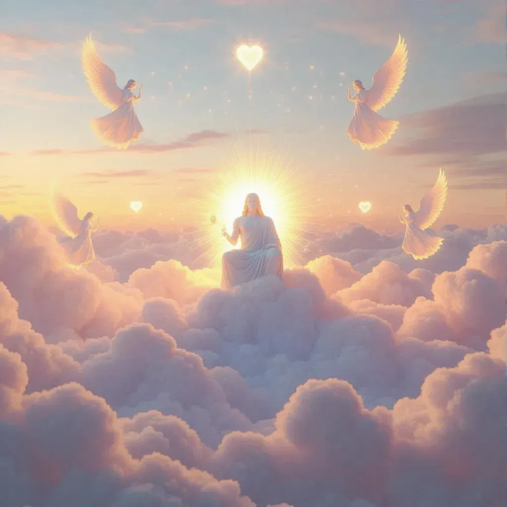 Create majestic celestial scenes with Vivago.ai's AI image generator. Craft divine deities enthroned on cascading clouds surrounded by hyper-realistic angelic figures, glowing star nebula clusters, and delicate heart-shaped wisps. Experience ethereal golden light, prismatic halos, and vibrant cerulean-to-lavender sky gradients. Generate surreal, dreamlike art blending divine power with whimsical softness through symbolic abstraction and hyper-detailed cloud textures.