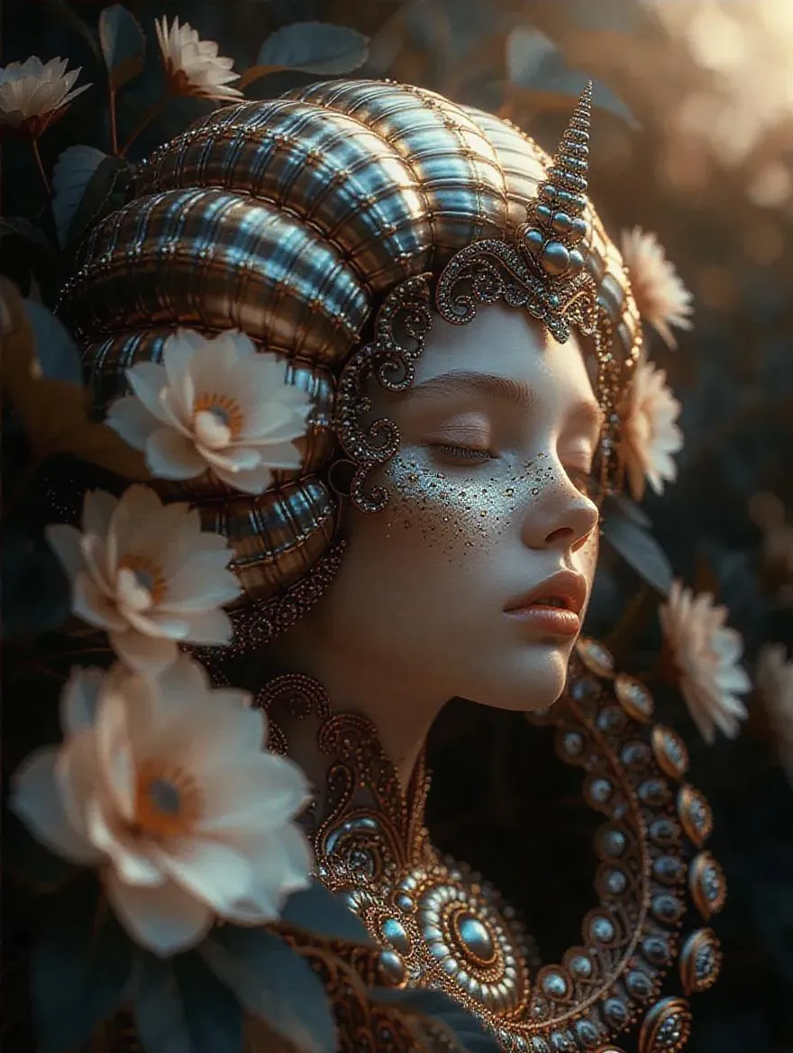 Transform your vision into surreal floral portraiture with Anmo's spiral shell design. AI-generated in brown silver and iridescent-blue hues. Explore vivago.ai's tools for professional-grade, mesmerizing visuals. Create ethereal art effortlessly using advanced AI effects and editing features.