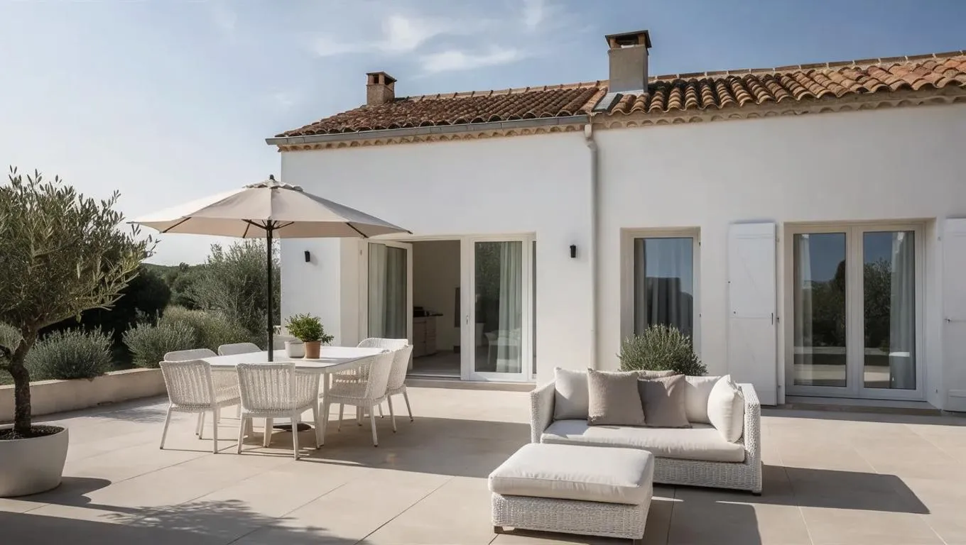 Generate a modern Provencal-style villa AI image with white facade, terracotta roof, and Mediterranean landscaping. Create serene terrace views featuring parasol pines and olive trees under perfect natural lighting using Vivago.ai's AI architecture visualization tools for realistic neo-bastide designs.
