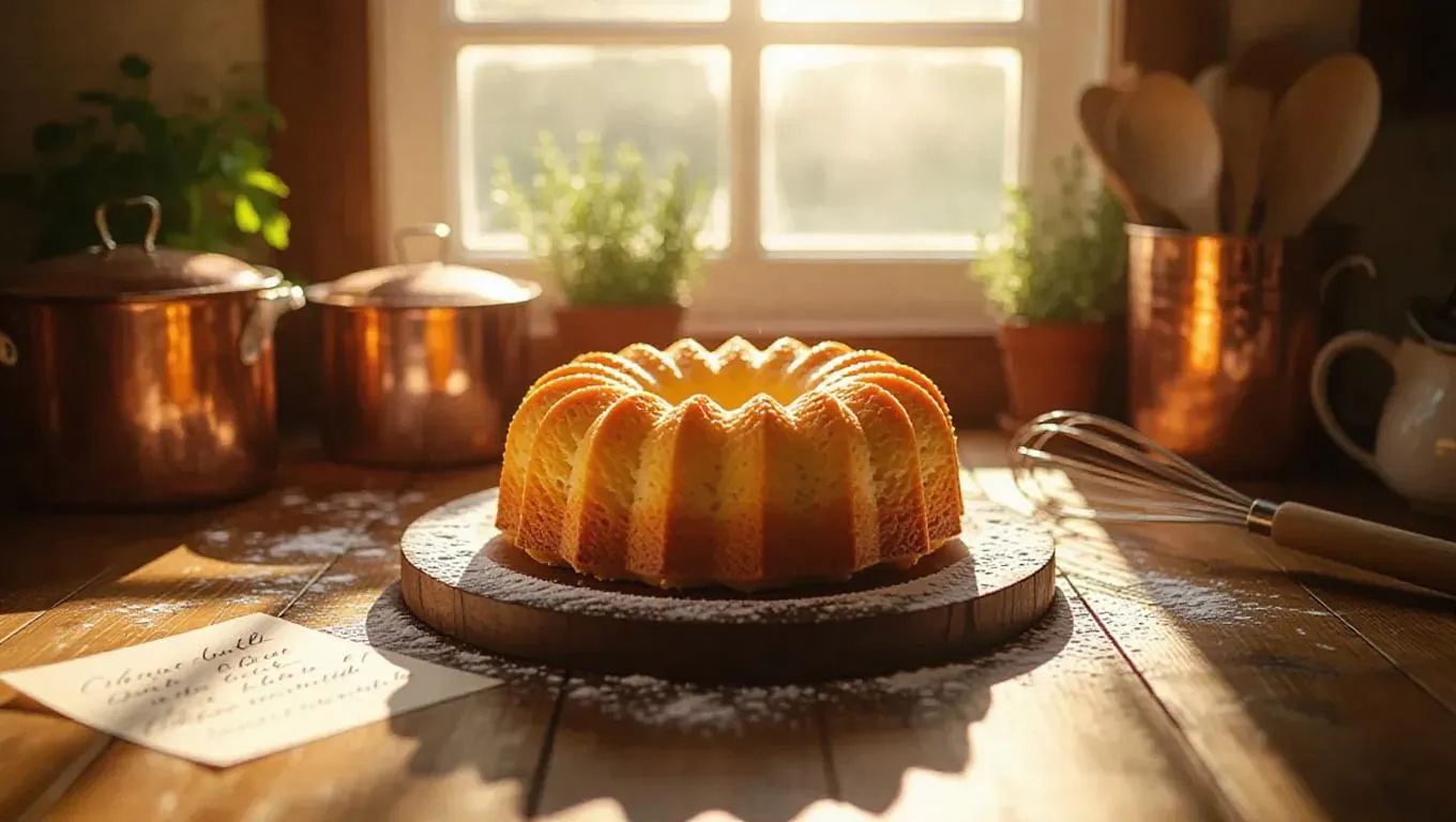 Create AI-generated culinary visuals with a golden, buttery cake centerpiece on a rustic table. Capture cozy kitchen charm, soft natural lighting, vintage utensils, and handwritten recipes. Perfect for cookbook covers, food blogs, or AI-enhanced professional food photography emphasizing texture, warmth, and appetizing details like cracked crusts, moist crumbs, and golden hues.
