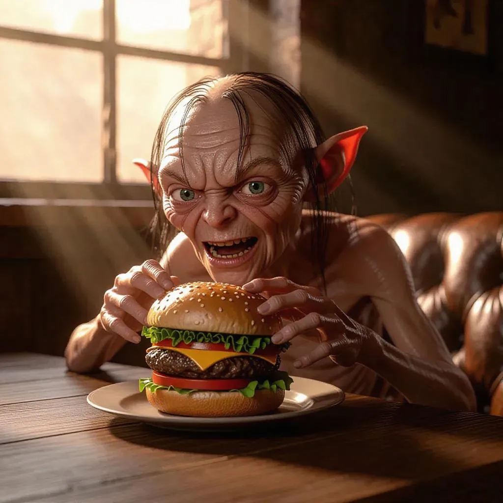 Create a vivid AI-generated 3D render of Gollum from Lord of the Rings savoring a juicy burger in a moody, dimly lit restaurant. Features hyper-detailed textures, dramatic soft light, rustic wood accents, and warm tones highlighting Gollum's expressive joy and wrinkled skin. Perfect for fantasy art, AI image generation, and immersive cinematic visuals.