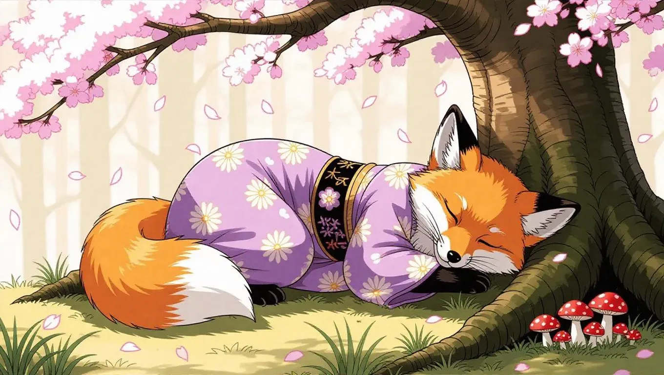 Create whimsical AI-generated ukiyo-e art featuring a chubby fox in a lavender kimono napping beneath cherry blossoms. Bold ink-wash textures, golden chrysanthemum patterns, glowing mushrooms, and pastel moss blend in this serene anime-inspired scene. Perfect for nostalgic nature visuals, anime aesthetics, and floral-themed digital artistry with Vivago.ai's AI image tools.