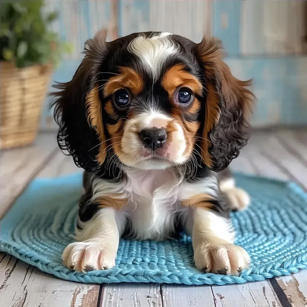 Generate lifelike AI images of an adorable Cavalier King Charles Spaniel puppy with expressive eyes, pink paw pads, and soft fur. Create high-detail 4K pet photography portraits featuring floppy ears, wooden floors, and cozy blue mats using AI-powered tools for realistic close-ups and professional editing.