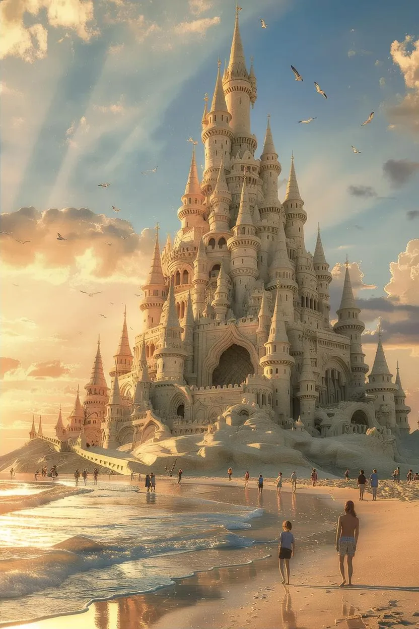 Ultra-realistic golden hour scene of a 100-foot sandcastle with intricate spires, arched bridges, and sculpted details resembling ancient architecture. Cinematic HDR highlights tactile textures as beachgoers marvel below, waves lap nearby, and seabirds circle. Blends magical realism with architectural craftsmanship in a summer wonder celebration. AI-generated visual masterpiece merging scale, realism, and golden-hour awe.