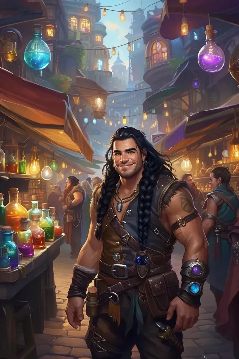 Vibrant steampunk metropolis hosts a bustling open-air market with stalls glowing under colorful lights, showcasing magical potions, wands, and artifacts. A brawny dwarf thief in goggles grins beside his towering half-orc barbarian wife amidst diverse crowds. Realistic ink painting blends mystic fantasy, cinematic details, and panoramic steampunk realism in this dynamic, full-body illustrated scene of magical commerce and multicultural adventure.