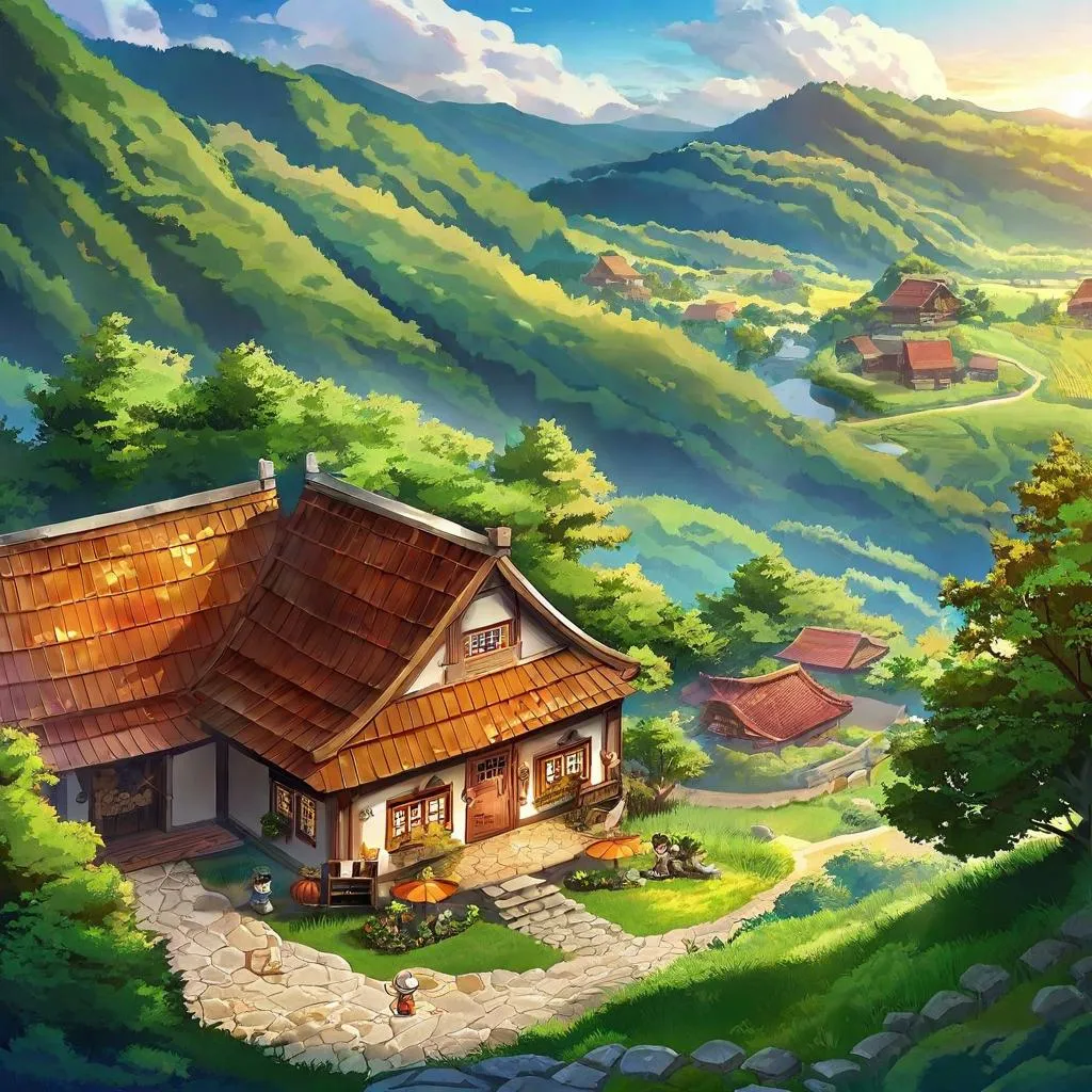 Discover AI-generated scenes of siblings Leonor and Lucas in a serene village nestled among verdant mountains. Bathed in sunset glow with rustic thatched roofs and cobblestone streets, this vivid artwork captures whimsical charm and nostalgic wonder. Create enchanting visuals with Vivago.ai’s AI-powered tools for professional-grade, golden-hued landscapes.