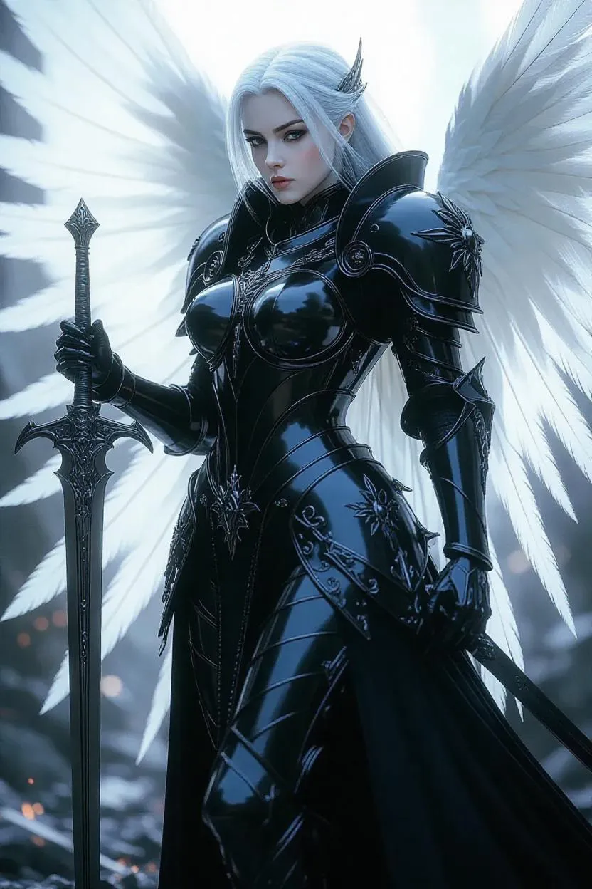 A stunning Adepta Sororitas battle sister with electric silver hair and luminous skin stands majestically in complete metallic black armor. Magnificent luminous feathered wings sprout from her back, intricately detailed. Her full body is draped in flowing crystalline silk. The background is a soft, ethereal blur. Inspired by Ash Thorp, Ian McQue, and Simon Stalenhag, this photorealistic, wide-angle portrait is a masterpiece of digital art. She wields a long sword above a battlefield.