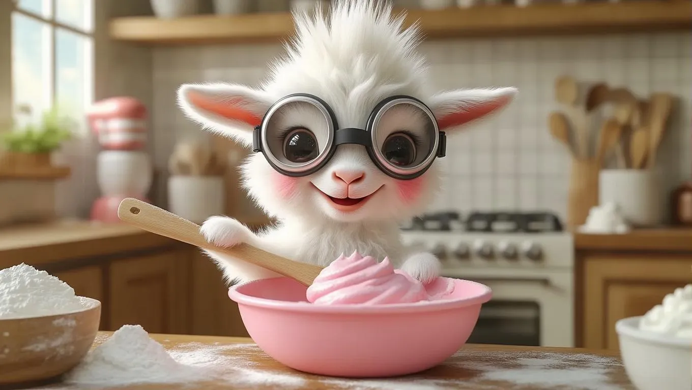 Generate whimsical 3D AI art of a fluffy mohawk baby goat wearing racing goggles, joyfully mixing pink cake batter in a kitchen. vivago.ai crafts hyper-realistic animal scenes with creative AI effects, transforming playful prompts into vivid digital storytelling. Ideal for quirky character design and charming AI-generated visual narratives.