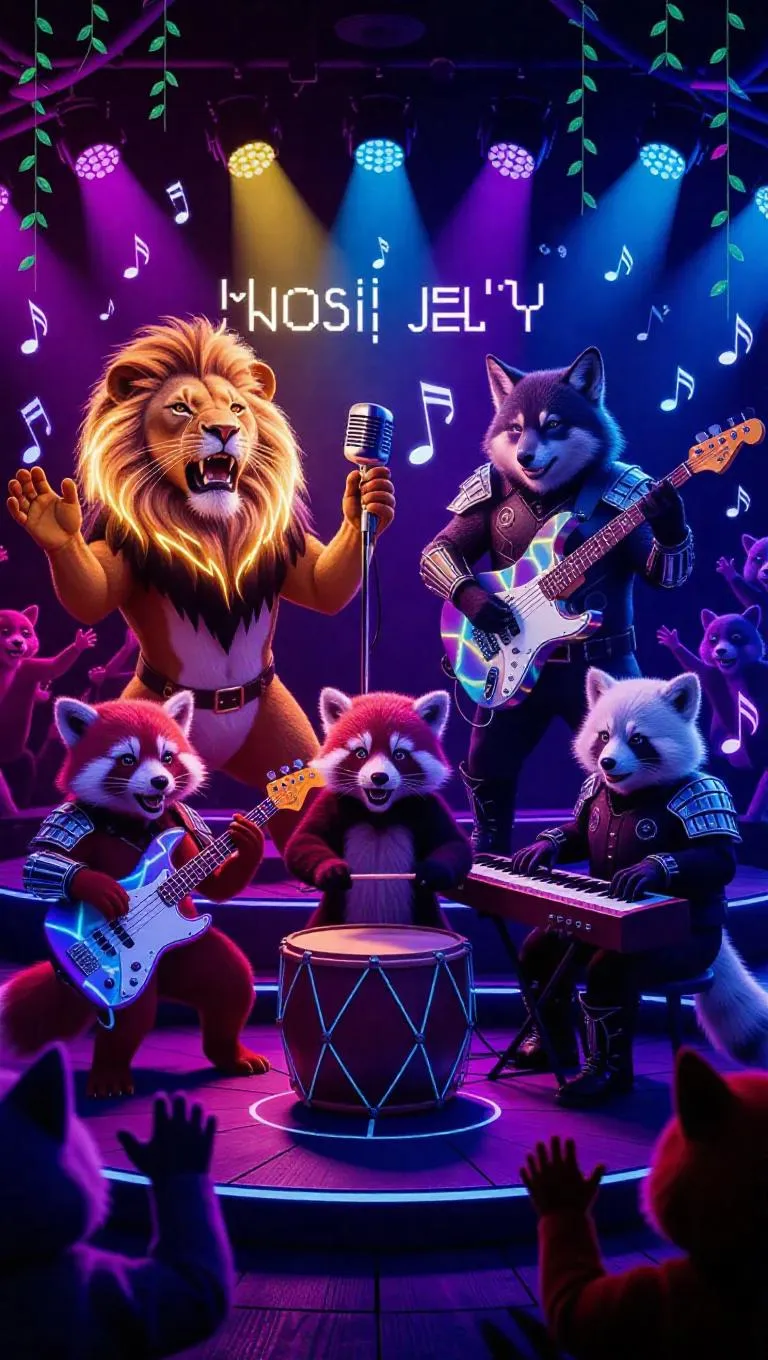 Vibrant AI-generated fantasy concert art featuring anthropomorphic animal musicians blending neon lights with organic elements. Detailed lion vocalist, wolf guitarist, red panda drummers, and arctic fox keyboardist showcase multi-textured fur, eco-friendly instruments, and holographic stage effects – perfect for digital artists seeking whimsical character design inspiration.