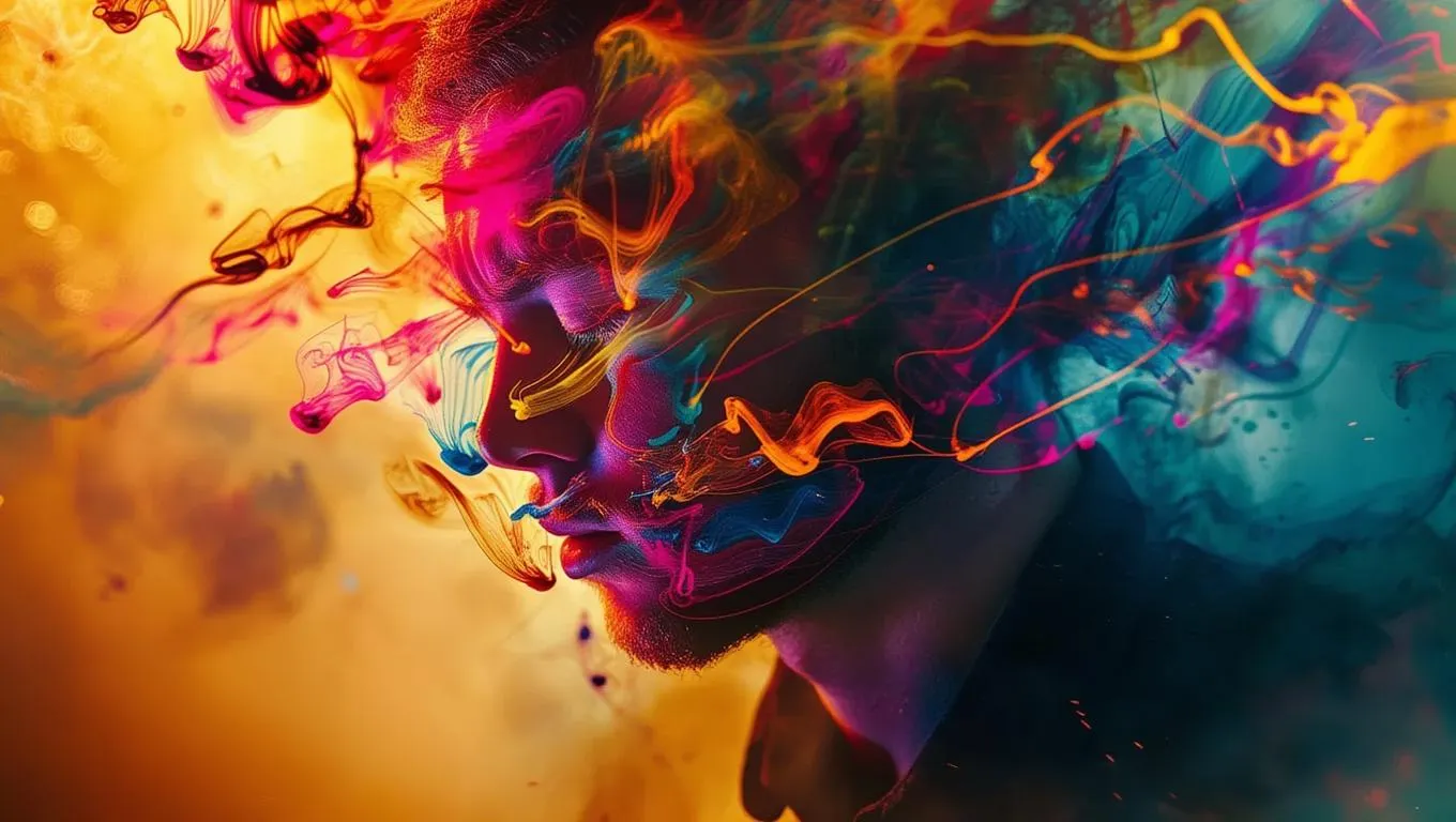 Explore AI-generated ADHD mental state visuals with this photorealistic cinematic photograph. Swirling abstract ink, clashing vibrant hues, and warm golden light evoke chaos and anxiety. Film grain texture, blurred edges, and shallow depth of field immerse viewers in overwhelming emotional turbulence, capturing the disorienting maelstrom of ADHD overload through hyper-detailed AI artistry.