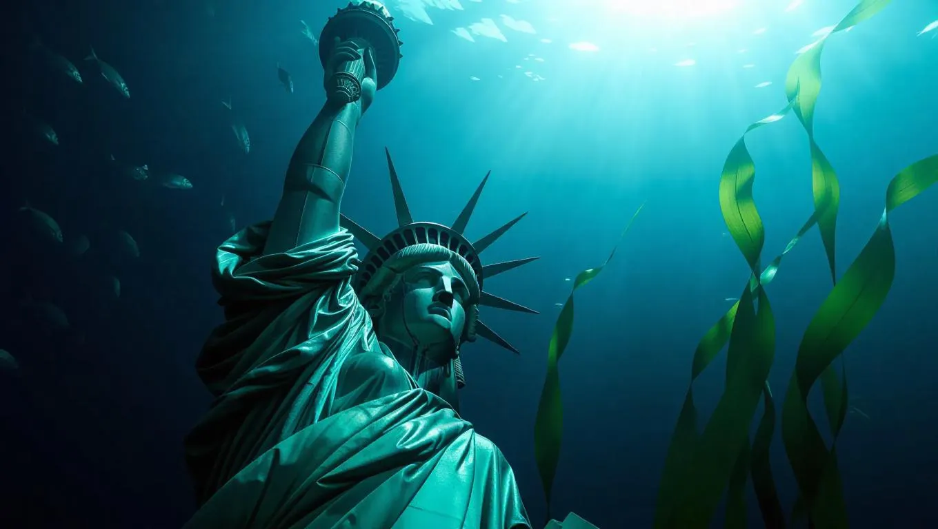 Looming large in the dark, mysterious abyss, the Statue of Liberty stands submerged, her copper surface engulfed by vivid green moss and seaweed, as tendrils of kelp sway gently in the faint, flickering currents, while schools of bioluminescent fish dart past her pedestal, illuminating the surrounding darkness, in an eerie, hyperrealistic underwater scene, shot from a low angle, with the statue's torch arm outstretched, as if shining a beacon of freedom into the desolate, black depths.