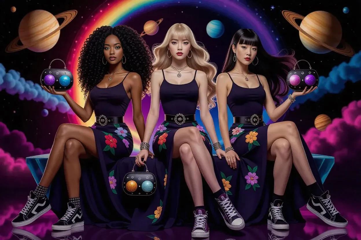 Explore AI-generated steampunk cosmic portraits at Vivago.ai. Featuring African, European, and Asian women in elegant streetwear-steampunk fusion, holding detailed planet handbags. Set against vibrant cosmic backdrops with futuristic glass chairs. Transform prompts into stunning visuals with our AI image generator for unique, professional-grade artwork.