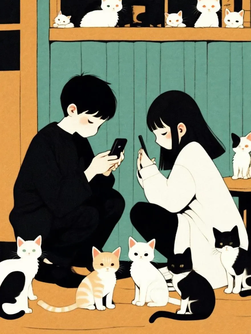 Transform text into vibrant pixel art illustrations with vivago.ai's AI tools. Create charming cat café scenes featuring anime-style characters - a cool black-clad boy photographing a white-dressed girl surrounded by kittens. Generate pixel-perfect AI artwork with detailed anime aesthetics and cozy café atmospheres effortlessly.