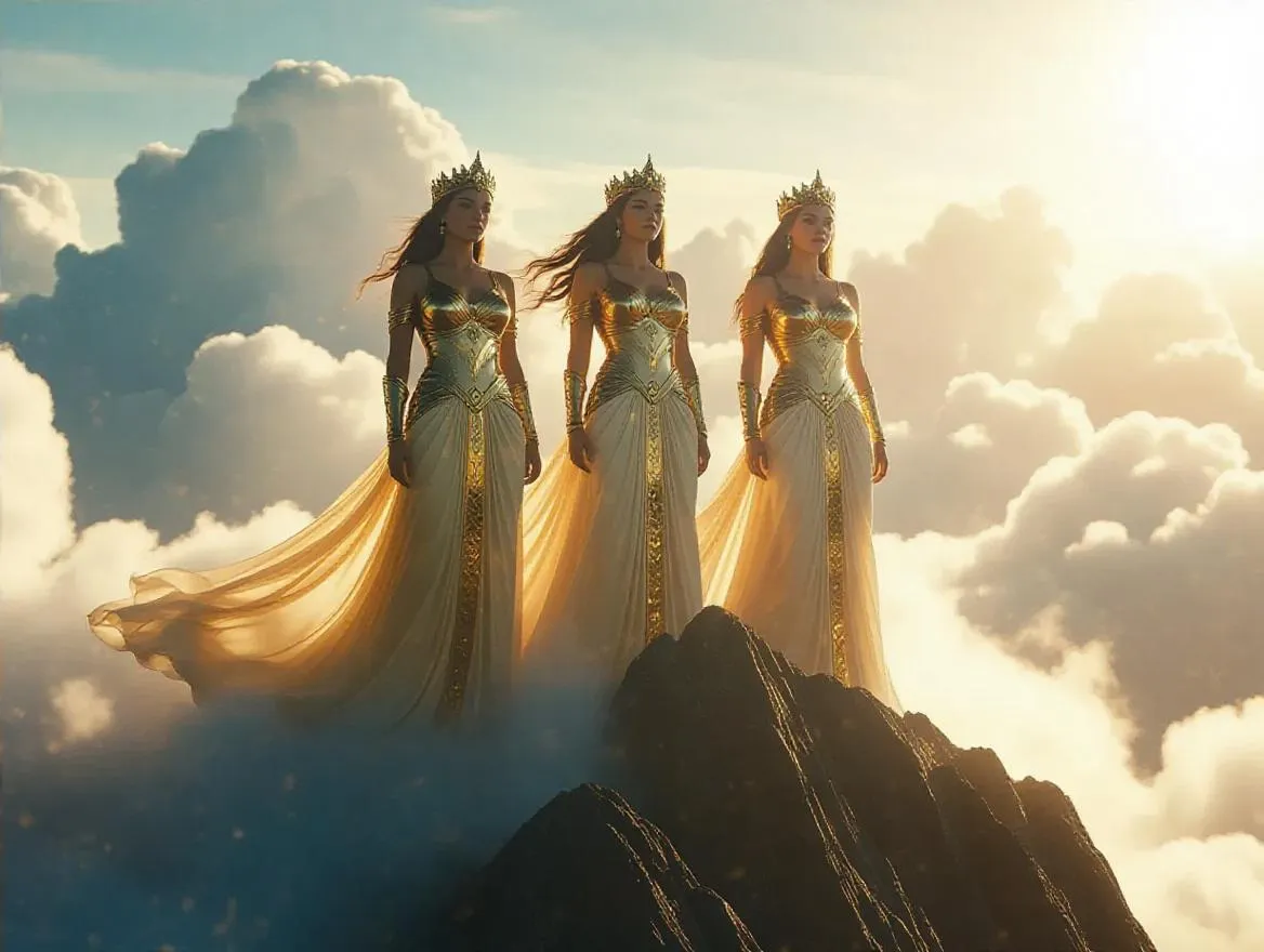 Three majestic Olympian goddesses, adorned in intricate, flowing garments, stand atop Mount Olympus, surrounded by ethereal clouds and divine light. Their beauty radiates, with detailed embellishments and regal crowns. The scene is cinematic, capturing the grandeur and majesty of the gods' realm.