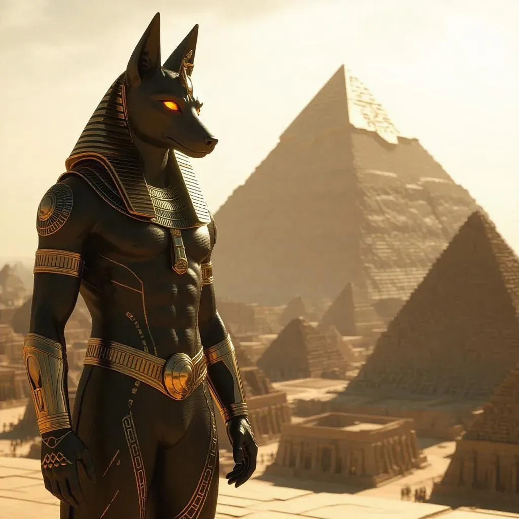 Futuristic Egyptian metropolis meets AI-generated art: envision a cybernetic Anubis deity in gold-tech armor overlooking a neon-lit pyramid city. Ancient motifs blend with futuristic materials, featuring glowing jackal masks, metallic bracers, and holographic temple-inspired skyscrapers. Perfect for sci-fi Egyptology themes, blending pharaonic grandeur with advanced tech aesthetics in vivid AI visuals.