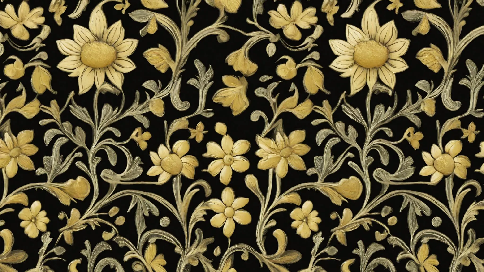 Create an AI-generated medieval floral tapestry with a black background, vibrant yellow flowers, and lush green leaves in symmetrical, repetitive patterns. Achieve leather-like textures and intricate vector designs using Vivago.ai’s AI tools for professional-grade image/video effects and seamless artistic compositions.