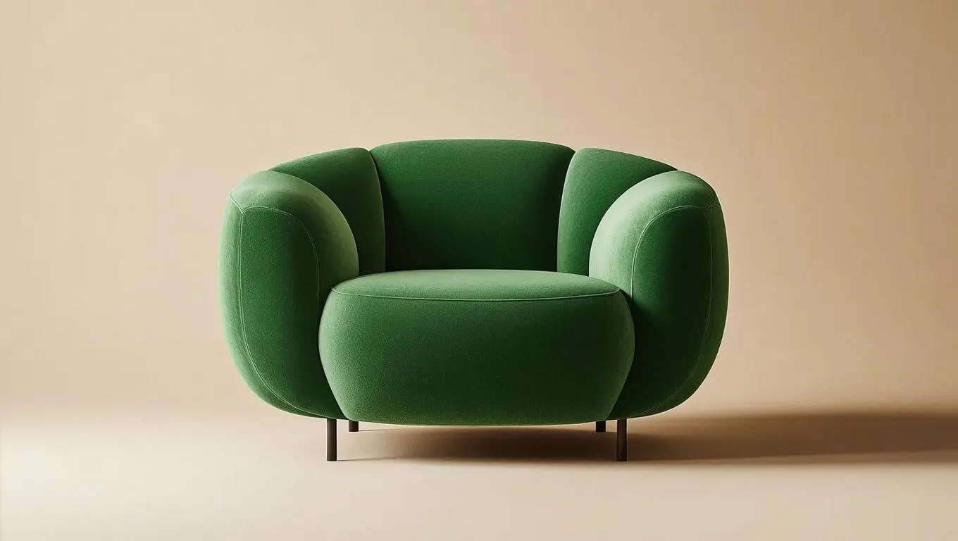Generate a high-resolution image of a modern green armchair isolated on a light beige backdrop, using Leica 35mm lens and 8k Super Resolution. Top-down perspective highlights comfort and contemporary design, ideal for interior design showcases and editorial photography.