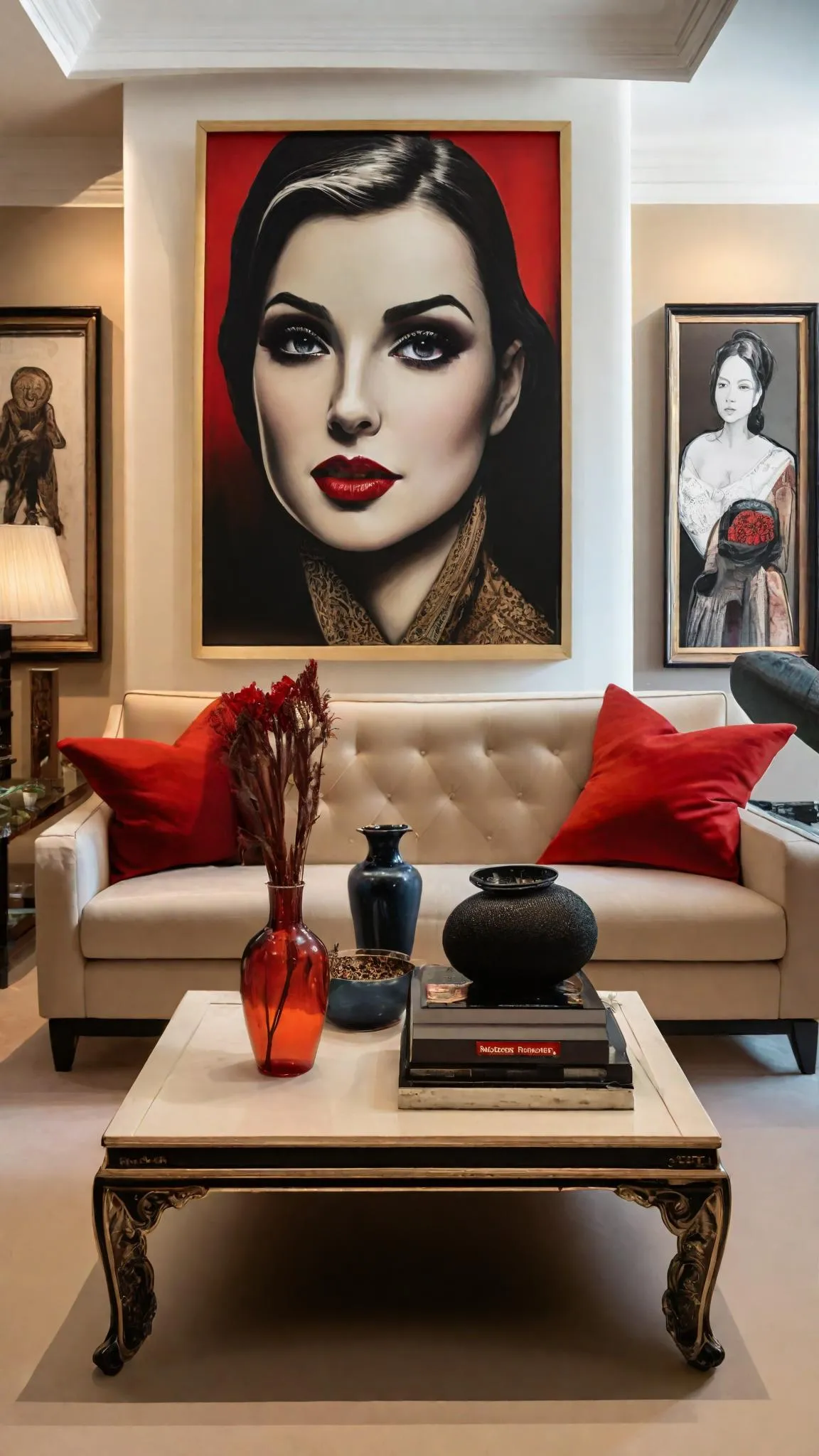 Create luxurious modern interiors with vivago.ai's AI tools. Generate artful living spaces featuring plush beige sofas, vibrant accents, sleek red coffee tables, gallery walls with bold monochrome portraits, and kaleidoscope floor lamps. Elevate elegance with curated mood lighting and sophisticated decor. Transform prompts into professional-grade visual designs effortlessly. #Artful #Luxurious #Elegant #Gallery #MoodLighting
