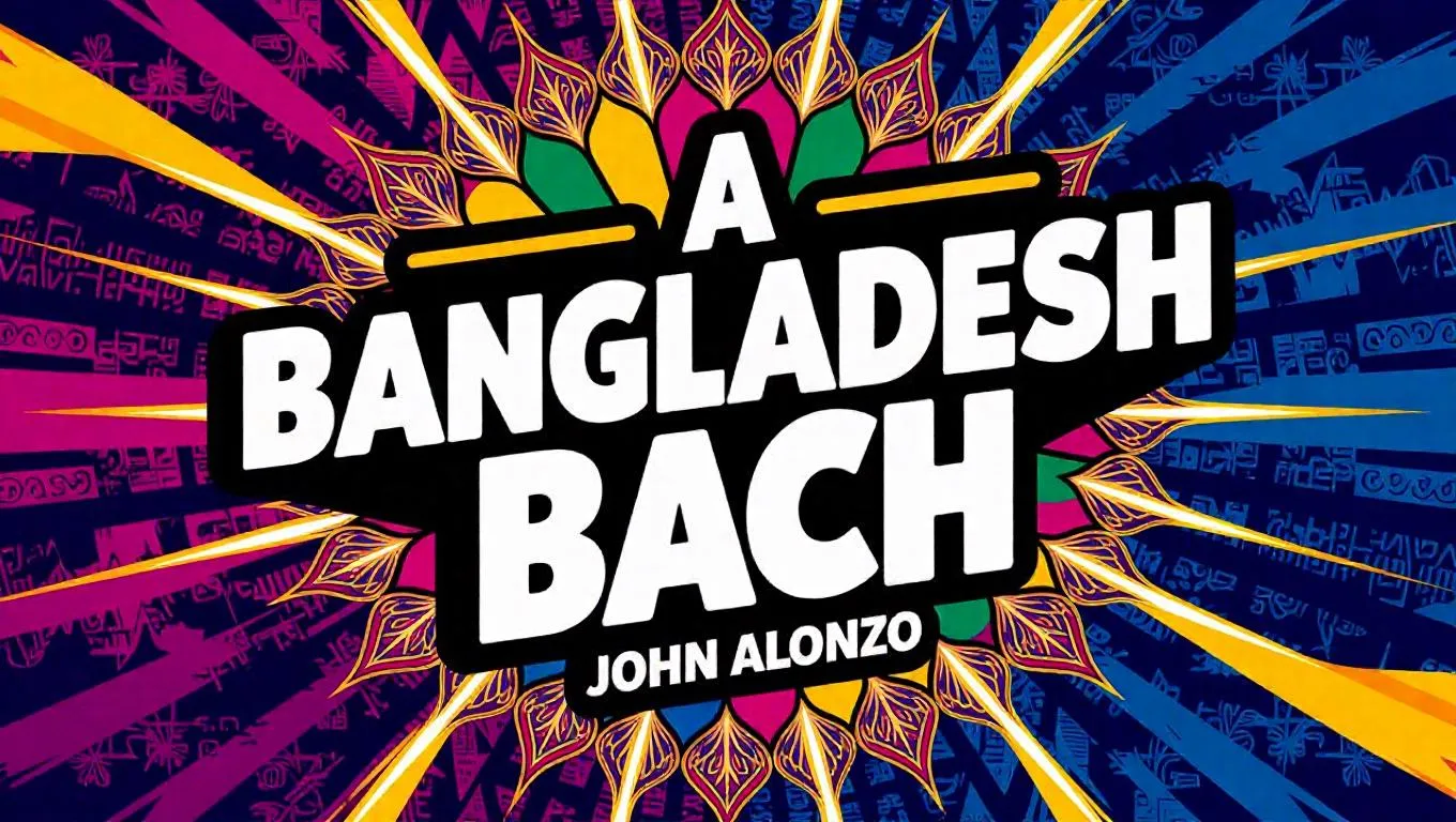 A vibrant, pop-themed music cover featuring the title "A Bangladesh Bach" and artist name "John Alonzo" in bold, eye-catching text. The background showcases a dynamic blend of traditional Bengali motifs and modern urban elements, with bright, saturated colors and a festive, energetic vibe, perfect for a Bangladesh Global South audience.