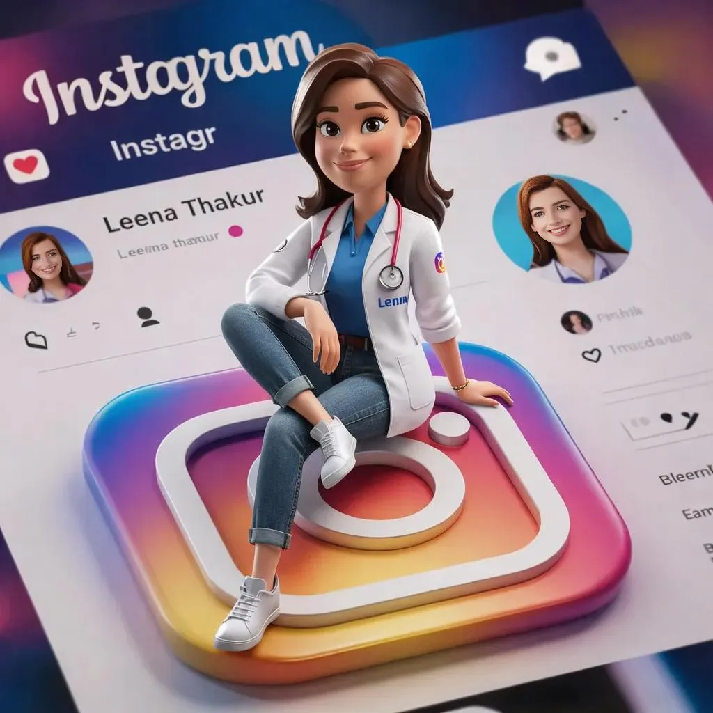 Create a vibrant 3D animated character lounging on Instagram’s logo, dressed in a modern white coat and casual attire. Set against a social media profile backdrop with username Dr. Leena Thakur. AI-generated visuals for engaging branding, professional yet approachable style. Perfect for enhancing your medical social media presence.