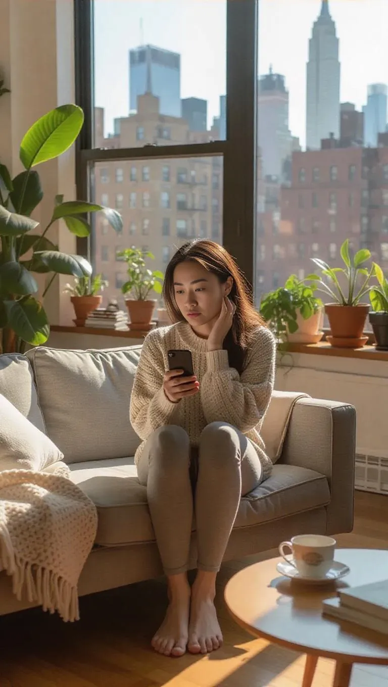 Create AI-generated images capturing mental exhaustion in urban life. Visualize a frustrated young woman in a cozy NYC apartment, engrossed in tech troubles. Features: modern sofa, city views, oversized sweater, indoor plants, serene ambiance. Perfect for depicting digital fatigue in comfortable home settings with natural lighting.