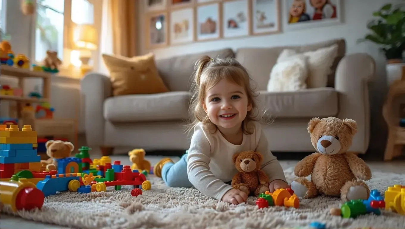 Create heartwarming AI-generated visuals of a cozy living room where a cheerful 3-year-old girl plays with stuffed animals amid colorful toys and family photos. Capture vibrant childhood joy and playful moments on soft rugs using vivago.ai's AI effects.