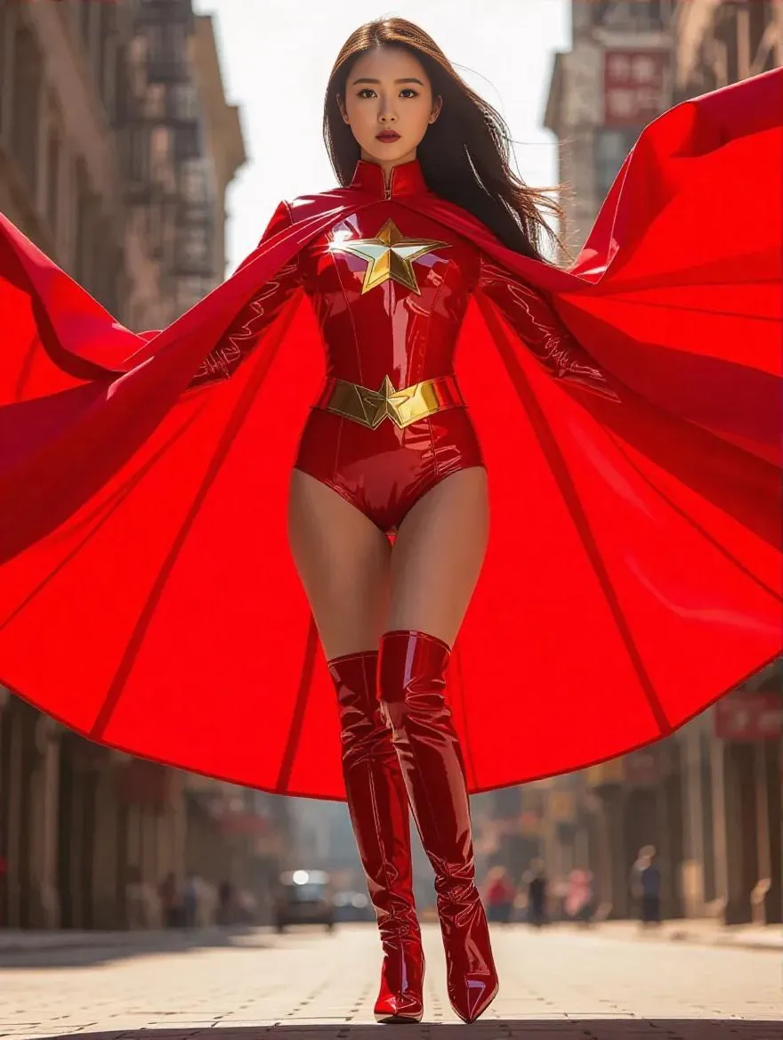 Create dynamic AI superheroine visuals with 360° full-body views. Generate 4K HDR images of Chinese heroines in red vinyl costumes, flowing capes, and star-embellished belts. Perfect cinematic superhero poses with Vivago.ai's AI tools - wind-swept capes, boots-crossed stances, and ultra-detailed character designs for professional superhero content creation.