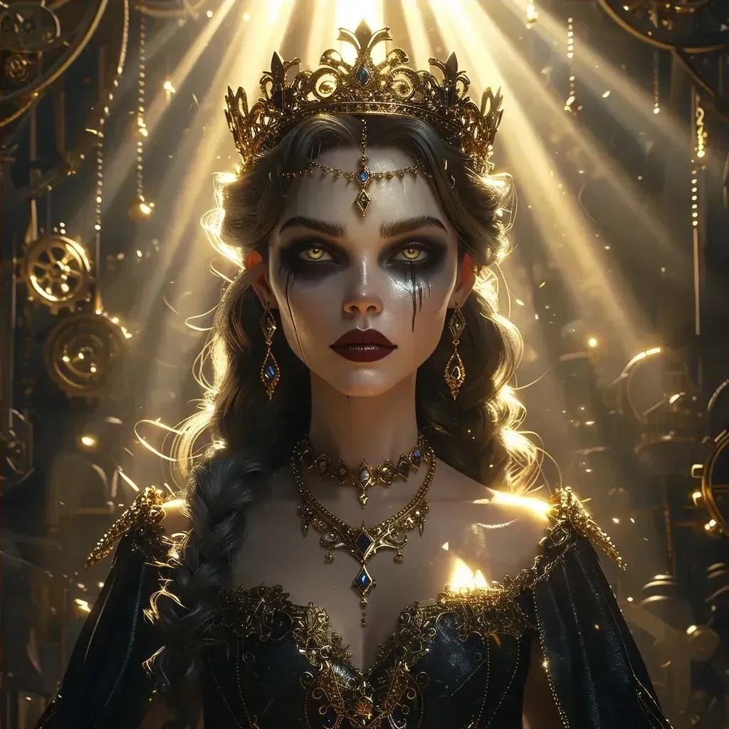 Explore AI-generated photorealistic 3D rendering of an undead princess blending fantasy and machinery. Featuring a golden crown, eerie glow-in-the-dark effects, intricate clockwork visuals, and dramatic lighting for haunting realism. Create stunning cartoon-style characters with ethereal beauty, ominous shadows, and surreal details using advanced AI image tools. Perfect for merging dark fantasy aesthetics with mechanical artistry. #Cartoon #3DRendering #GlowInTheDark