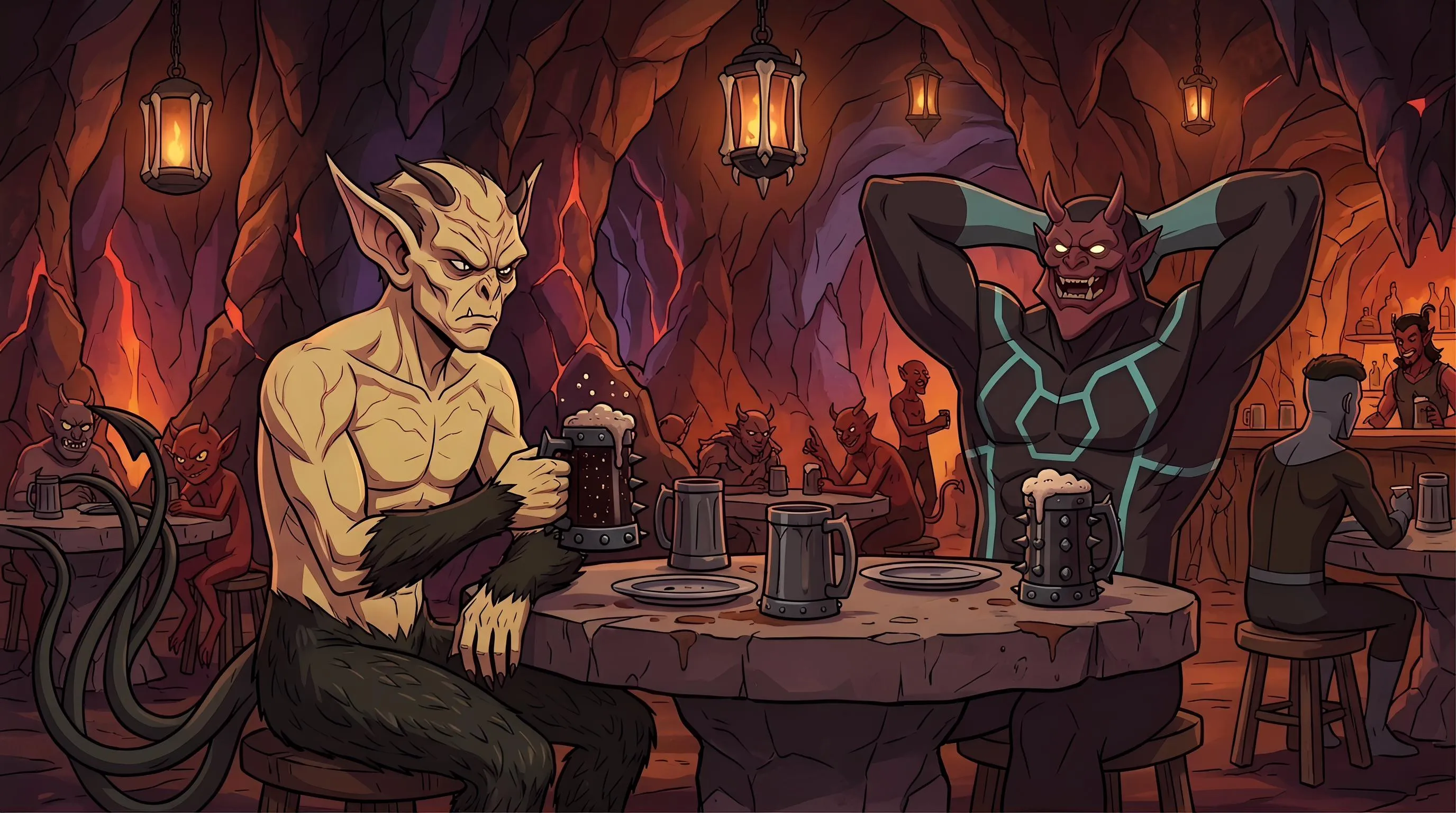 The Woodsie Lord and Satan drinking beer in Hell's pub