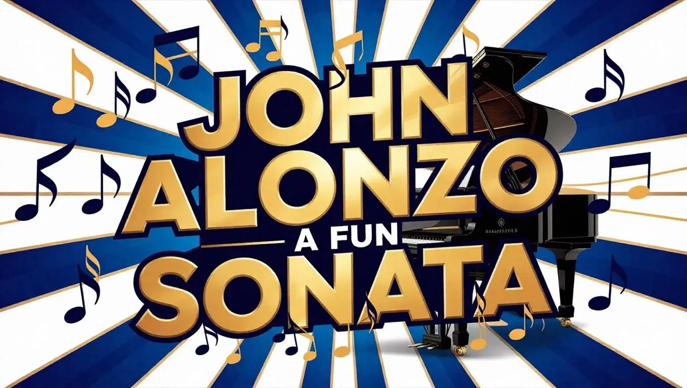 Create a viral Mozart-inspired rock-pop album cover with AI: "A Fun Sonata" by John Alonzo in bold blue/gold text. Blends Piano Sonata 16 motifs with edgy visuals for maximum engagement & earning potential. AI-generated artwork merges classical elegance and modern energy.