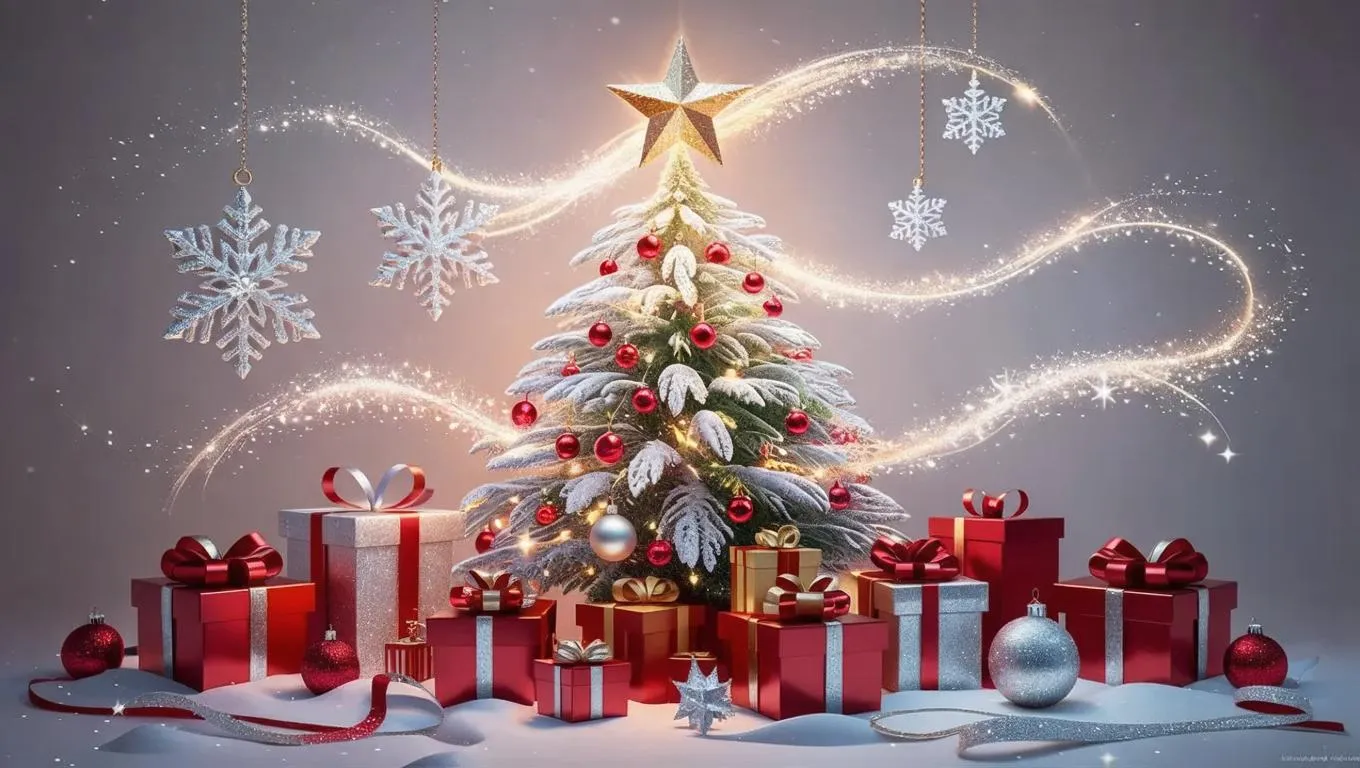 Experience a magical New Year scene with an AI-generated festive tree adorned in shimmering snowflakes, red-silver ribbons, and a golden star. Gifts wrapped in elegant paper, a minimalist holiday card, and a serene snowy backdrop evoke warmth and hope. Perfect for creating holiday visuals with AI image tools—ideal for cards, social media, or festive branding.