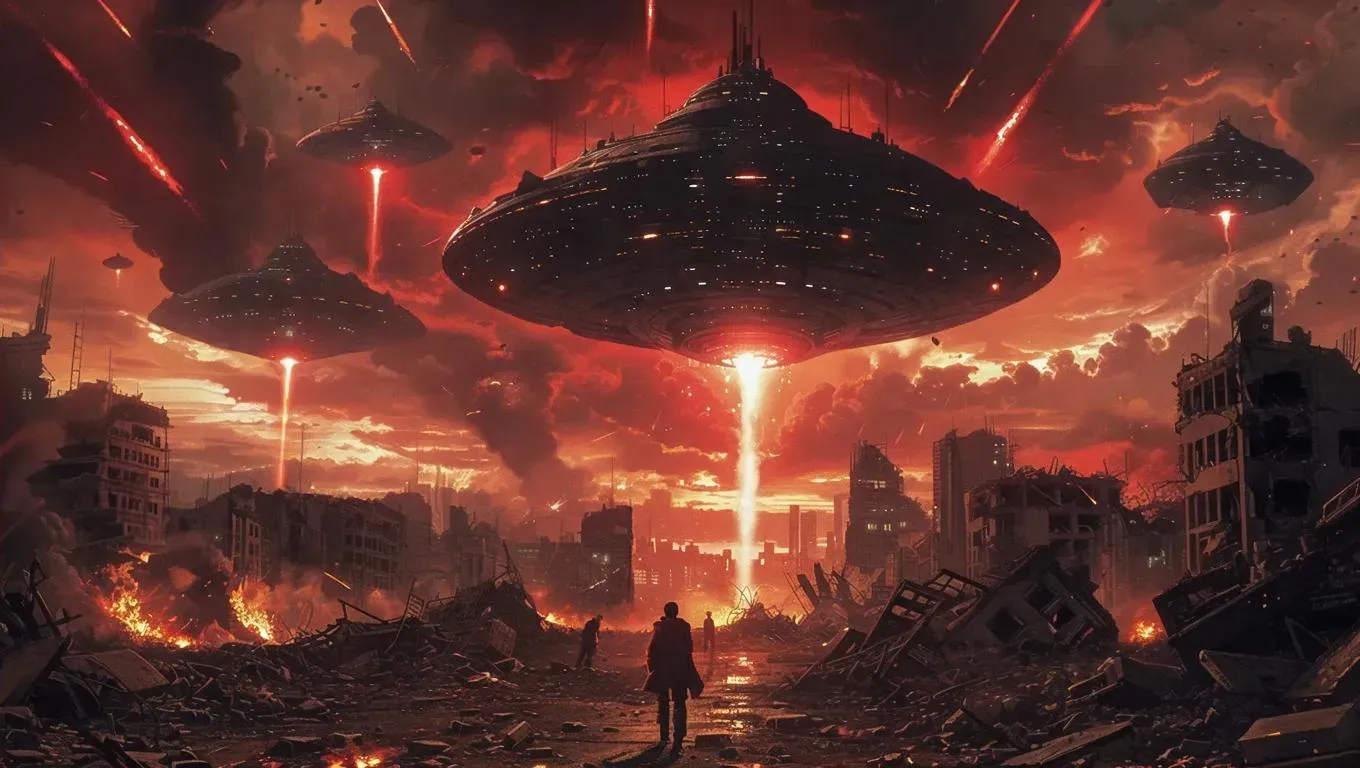 Experience a dark apocalyptic anime scene with fiery cracks splitting the sky as sleek alien warships descend. AI-generated destruction showcases crumbling cities, scorched earth, and desperate survivors in vibrant colors and dynamic lighting. Perfect for sci-fi visuals, this intense artwork highlights Vivago.ai's advanced AI effects for professional-grade creative transformations.